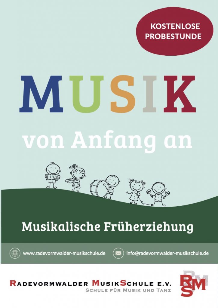 Musik begeistert Kinder von Anfang an. Unsere musikalischen Angebote für kleine Kinder laden zum Singen, Bewegen, Lauschen und Entdecken ein. Spielerisch fördern wir Freude an Musik, Rhythmus und gemeinsames Erleben. Die Radevormwalder Musikschule e.V. bietet drei aufeinander aufbauende Kurse für unterschiedliche Altersstufen an. Alle Kurse finden einmal wöchentlich für 45 Minuten statt. Die Kurse „Die Tönchen“ und „Die Tonwerkstatt“ beginnen jeweils nach den Sommerferien. Ein späterer Einstieg ist nach Absprache möglich.